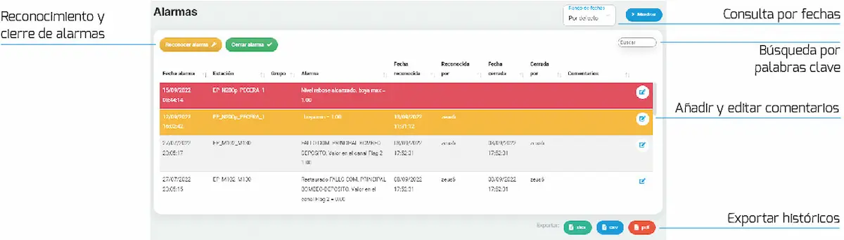• Histórico de todas las alarmas generadas y capacidad para su reconocimiento, cierre e inserción de comentarios.